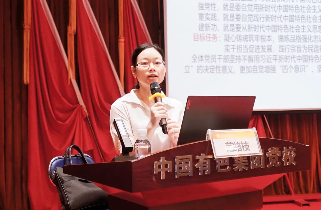 仪式后,湖北理工学院马克思主义学院教授范绪枝以《高举伟大旗帜 推进伟大复兴》为题,结合主题教育,聚焦党的历次全国代表大会、党的二十大报告等内容,讲授了开班第一课。